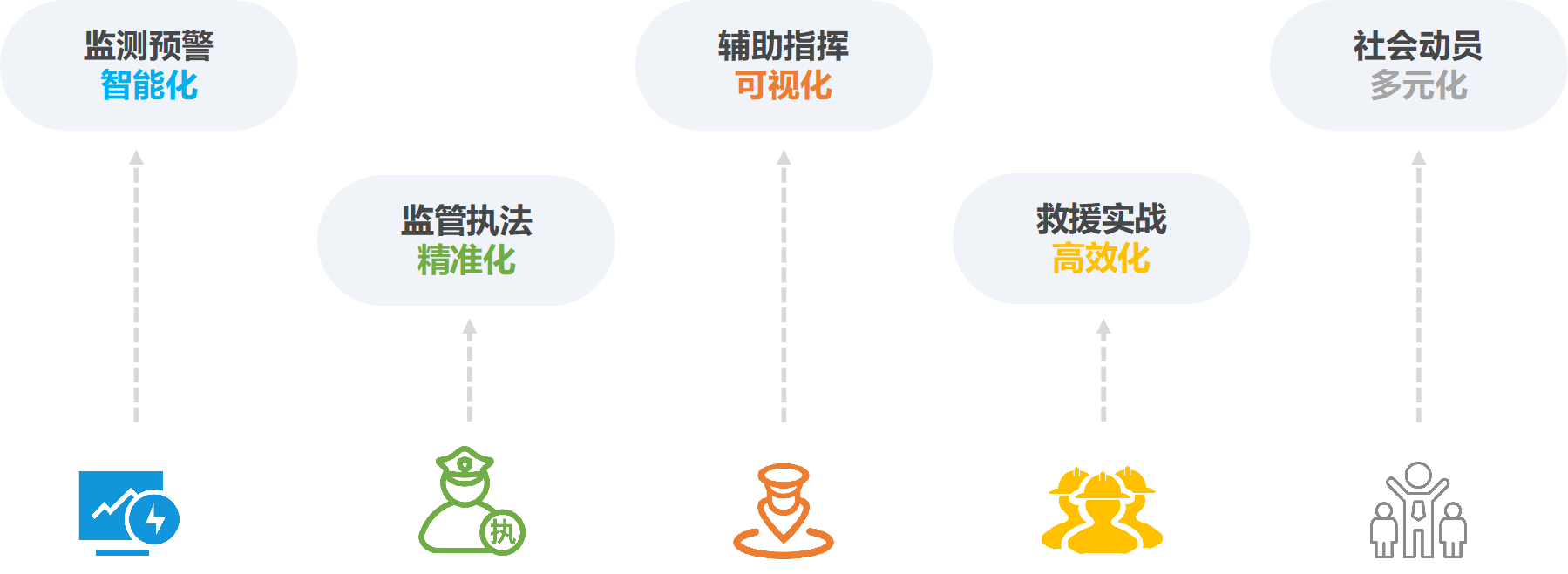 在數字政府建設的基礎和應急管理信息化建設的成果支持下,我們圍繞城市安全治理和應急管理的需求,積極創新管理模式,優化業務流程,進行戰略布局并探索應急管理的“一圖統管”數字底座及“1+N”應用體系。我們持續深化監測預警、監管執法、輔助救援以及聯合指揮等各細分場景的應用,逐步實現信息的清晰掌握,底數的明確以及資源的有效利用,以實現應急管理的“一圖全面感知、一鍵可知全局、一體運行聯動”的目標。